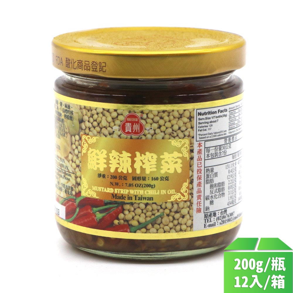 遵古釀造;口味最獨到 真空包裝;衛生最可靠 精選台灣農漁產極品調製 台灣貴州醬業有限公司榮譽出品 精選台灣農漁產品極品調製,以建立HACCP管制系統及FDA酸化商品登記。 1. 系列說明:醬菜/罐頭 2. 主要用途:食物料理 3. 主要成份:標示於產品外包裝 4. 商品說明:廠商-貴州/廠牌:貴州 5. 保存方法:放置陰涼處、避免陽光直射。發票寄送